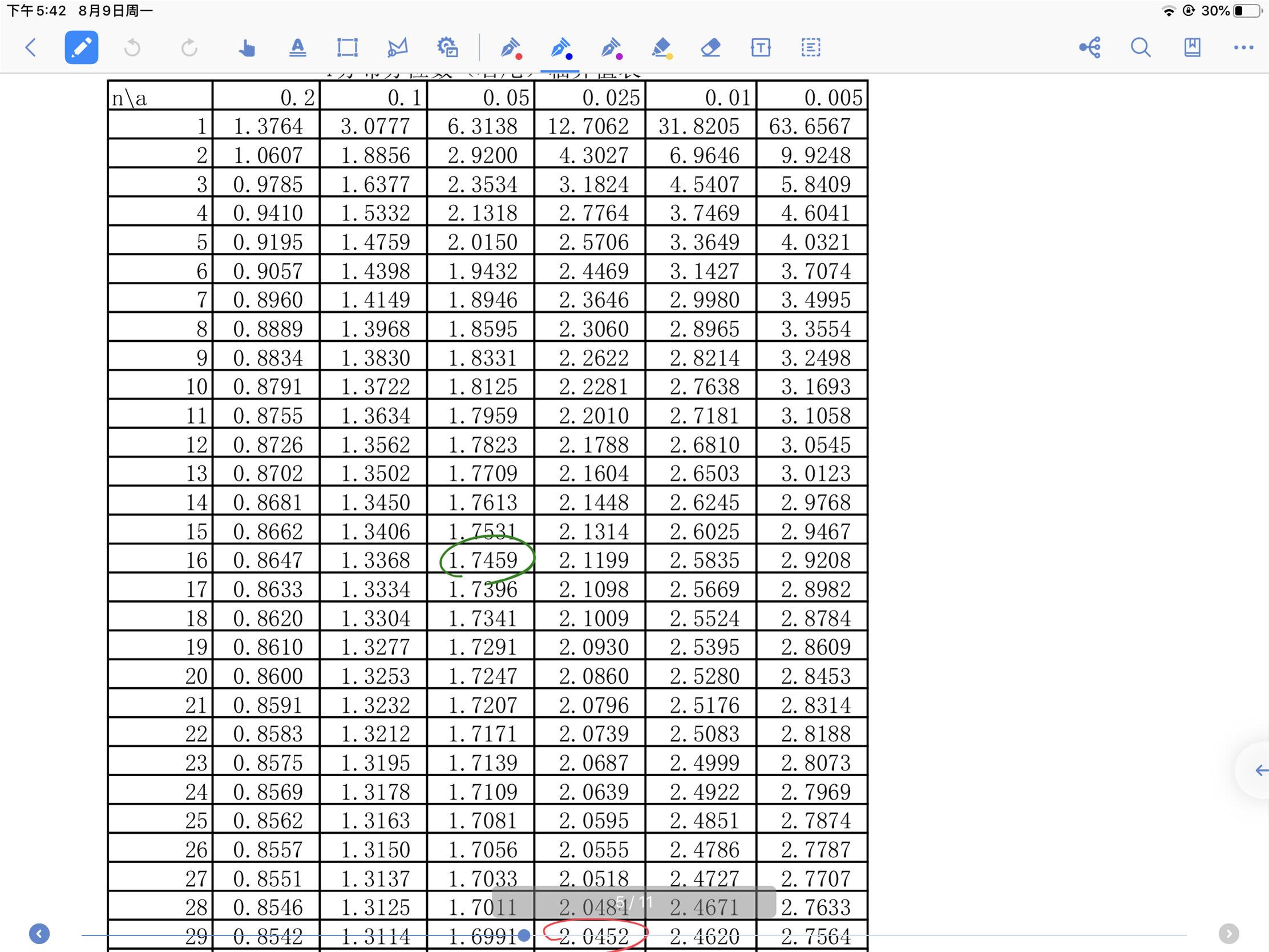 请问这个表格是双尾的值吧?可是为什么上面alpha的值还用的是α而不是α/2,就那个2.045在正常t分布表中应该是0.025的列