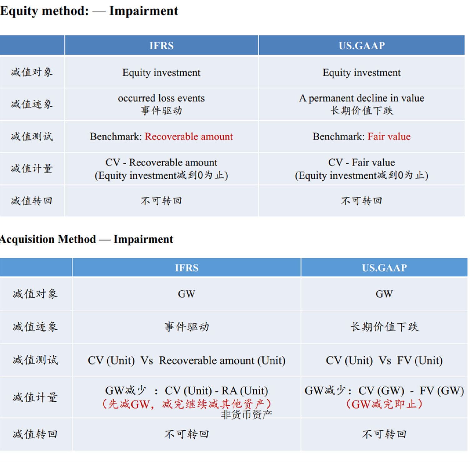 您好,同学,我附上了一张表,里面有对于equity investment和goodwill的减值介绍;