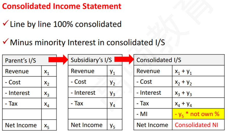 我给你截了张图,给您看看consolidation的NI计算,【其实很简单,就是母公司利润表和子公司的利润表逐行合并,完成之后,减去子公司的NI✖not owned%】