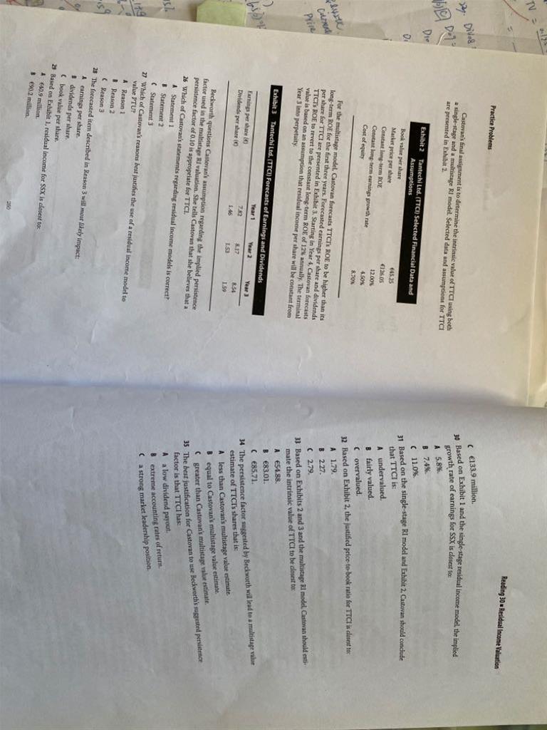 3、34题:问根据B同学假设的持续因子,那么用多阶段模型算出来的估值和C同学的相比是高了低了还是一样。因为B同学质疑的只有C同学关于持续因子的假设,C同学假设residual income per share will be constant from Year 3 into perpetuity.也就是说RI不衰减,那么持续因子就等于1。B说持续因子为0.1比较合理。持续因子低RI衰减的快,那么估值也就会偏低。因此选A.