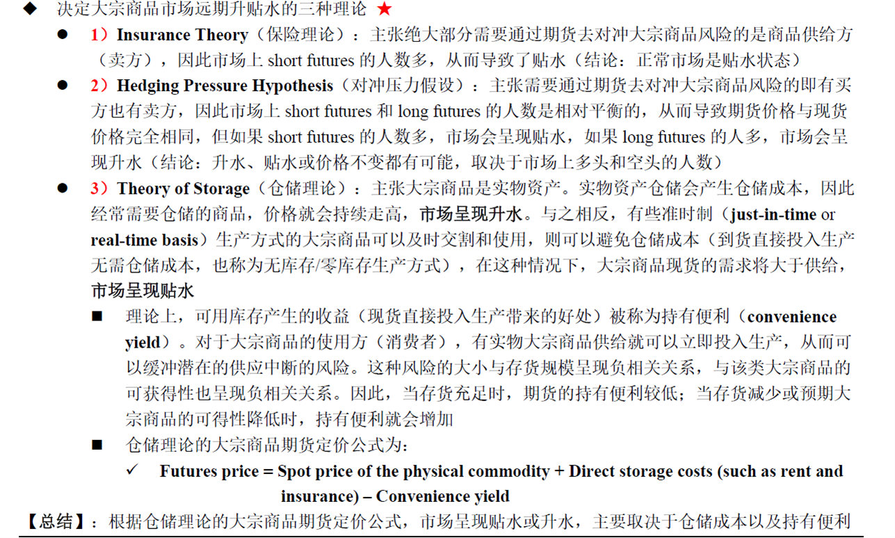 A选项,Insurance Theory(保险理论):主张绝大部分需要通过期货去对冲大宗商品风险的是商品供给方(卖方),因此市场上short futures的人数多,从而导致了贴水(结论:正常市场是贴水状态),从表2来看,咖啡是升水的状态,所以不符合这个理论的原理。