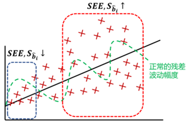 如下图所示,绿色的虚线表示正常的残差的波动幅度,应该处于恒定状态,如果存在条件异方差,残差会随着自变量的增大而增大,因此在前端自变量很小时,残差也会偏小,所以如果取这段的数据做样本,回归的SEE就会小,从而导致sb变小,t检验统计量偏大,更容易拒绝原假设,易犯一类错误。