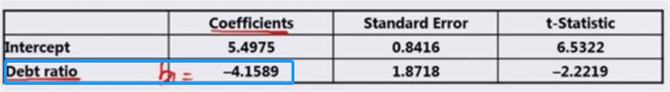 你好,b1就是第一个自变量的回归系数,也就是这里debt ratio的coefficient,是-4.1589