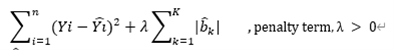 下面这张图就是一个LASSO惩罚回归模型,这里加入的惩罚项就是lambda那项,我们的目的是使下面那个公式的值最小。