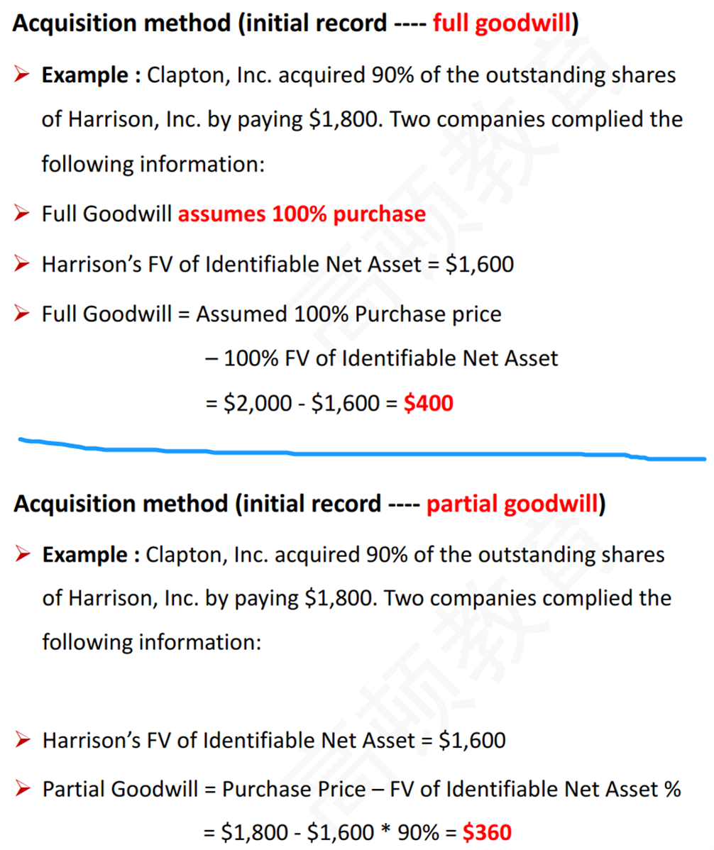 2. 如果我按你跟我说的 我理解为100%收购下 才会产生Full good will 且无MI ,但你给的例题里90%收购?那讲义里干嘛full good will下出来一个MI的公式?那equity method 下求gw 求的是部分还是全部呢?