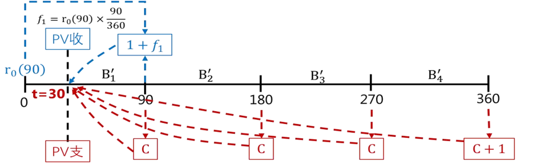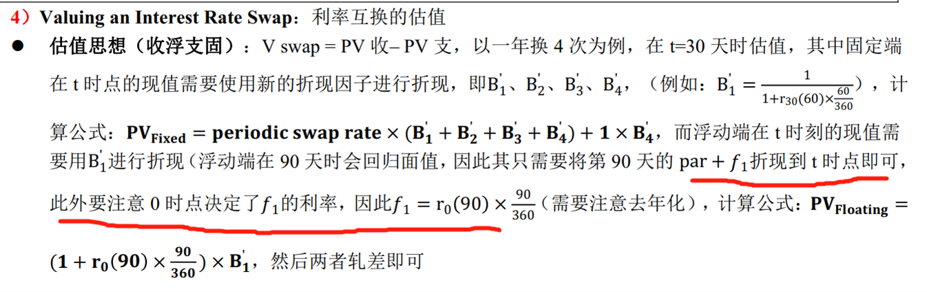 第34题浮动端的计算:在每个季度到期前浮动端的现值=原浮动端f1/新的浮动利率;此时如何能够保证到到期时浮动端的价值=面值?也即本题中90天时浮动端=1。谢谢