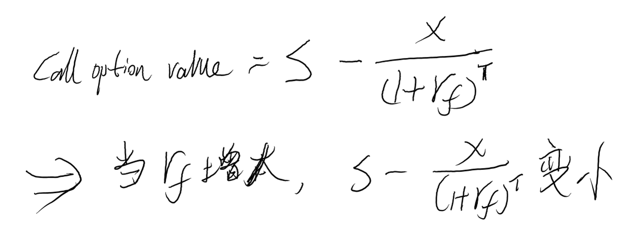 您好同学,rf的增加,会让call option price减小,不是增加!!!