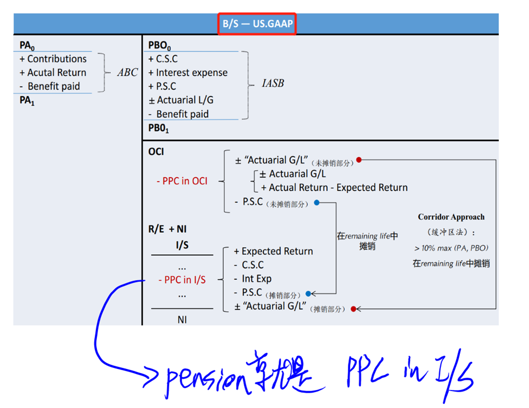 CSC和interest 在OPB和pension 中都有,但是expected return在属于pension和 PPC in OCI的科目,在PBO中并没有expected return