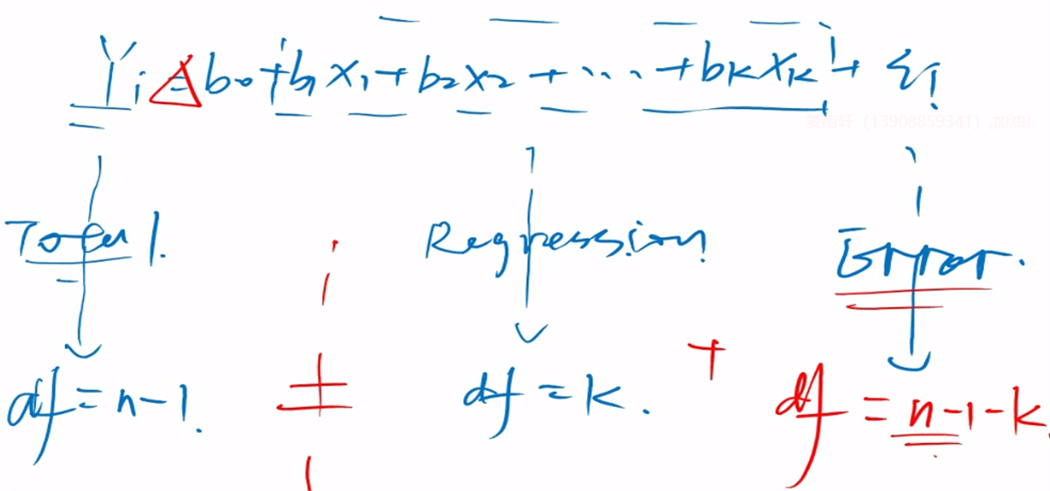 请问一下老师自由度到底应该怎么理解?前面说单元回归的自由度等于n-2,因为受到b0和b1的影响,这里又显示单元回归的自由度是k,单元回归残差的自由度是n-2,有点乱