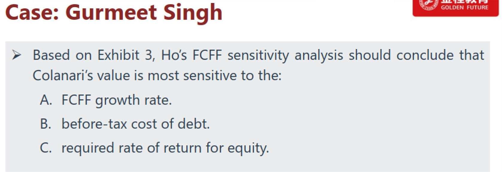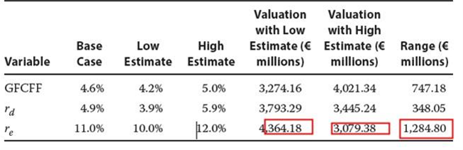 我们把low estimate和high estimate 的三个参数对应的每个参数变化对应的估值结果算出来,得到下图。我们发现,在high estimate中,由于re变化导致估值结果减小的最多,在low estimate中也是re变动导致的估值增加的最多。因此选C.