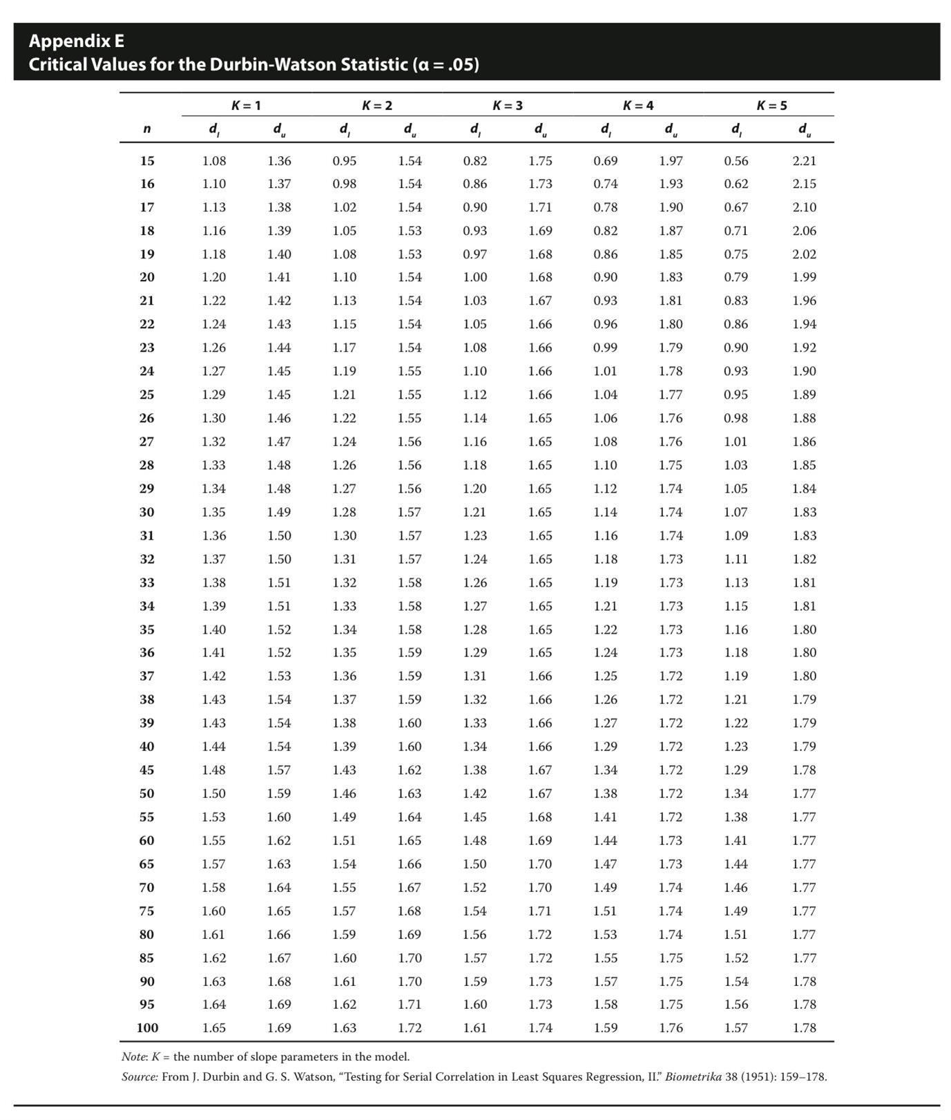 你好,现在机考考察范围较广,建议掌握,考试不排除可能给考生一部分临界值表让你选择用哪个数值的可能性。可以看下原版书的appendix E(下图),查表很简单,纵列n代表样本数量,横列K代表回归方程中的斜率参数的个数,就可以找到对应的du和dl,掌握到这里,能够判断正负或无序列相关就好了。