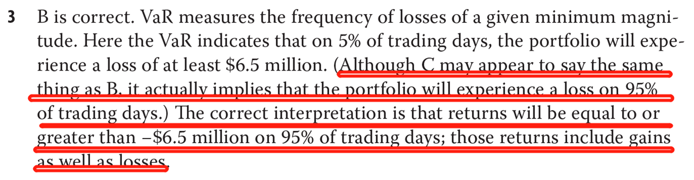 这题的C选项是表述上有问题。它说:Ninety-five percent of the time, the portfolio can be expected to experience a one-day loss of no more than $6.5 million.这句话实际上的意思是95%的时间,组合会experience a one-day loss,只不过不会超过$6.5 million . 关于这一点本题的答案里也是说明了的。