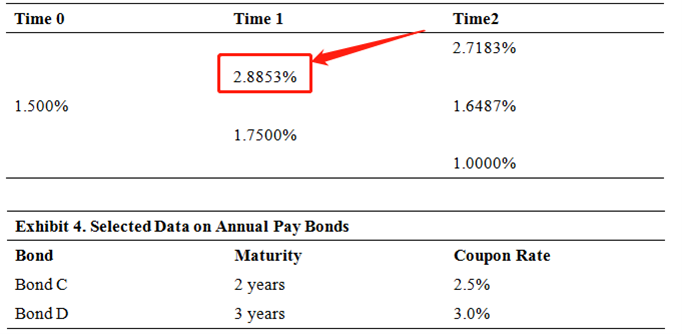 由exhibit 4可知bond C是两年期债券,在t=2时,现金流是par+coupon=102.5,折现一年为102.5/1.028853=99.6255。
