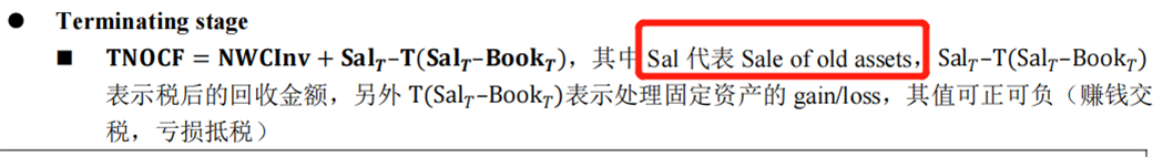 对于terminating stage, 为什么不是NWC INV+sell price of fixed capital - (sell price - salvage value)*T? 如按讲义中列示,是默认就是按salvage value卖的?但是salvage value不应该就等于账面价值吗,意义何在?