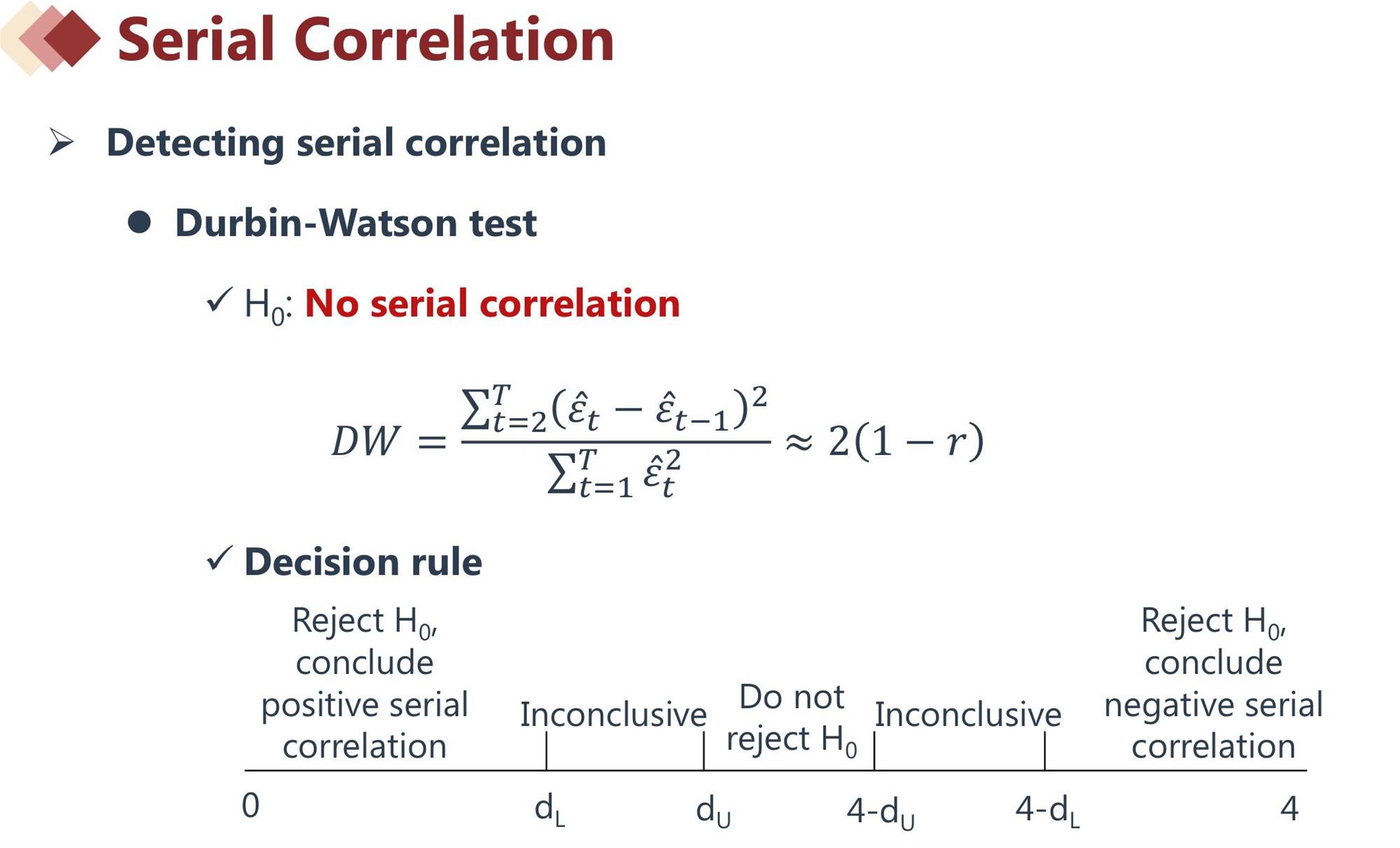 1.是这样的,因为trend model本质是一个以时间作为自变量的一元线性回归,所以使用线性回归中检验序列自相关的DW检验,DW=2(1-r),其中的r是残差和残差之间的相关系数。具体的步骤见下面的附图讲义。