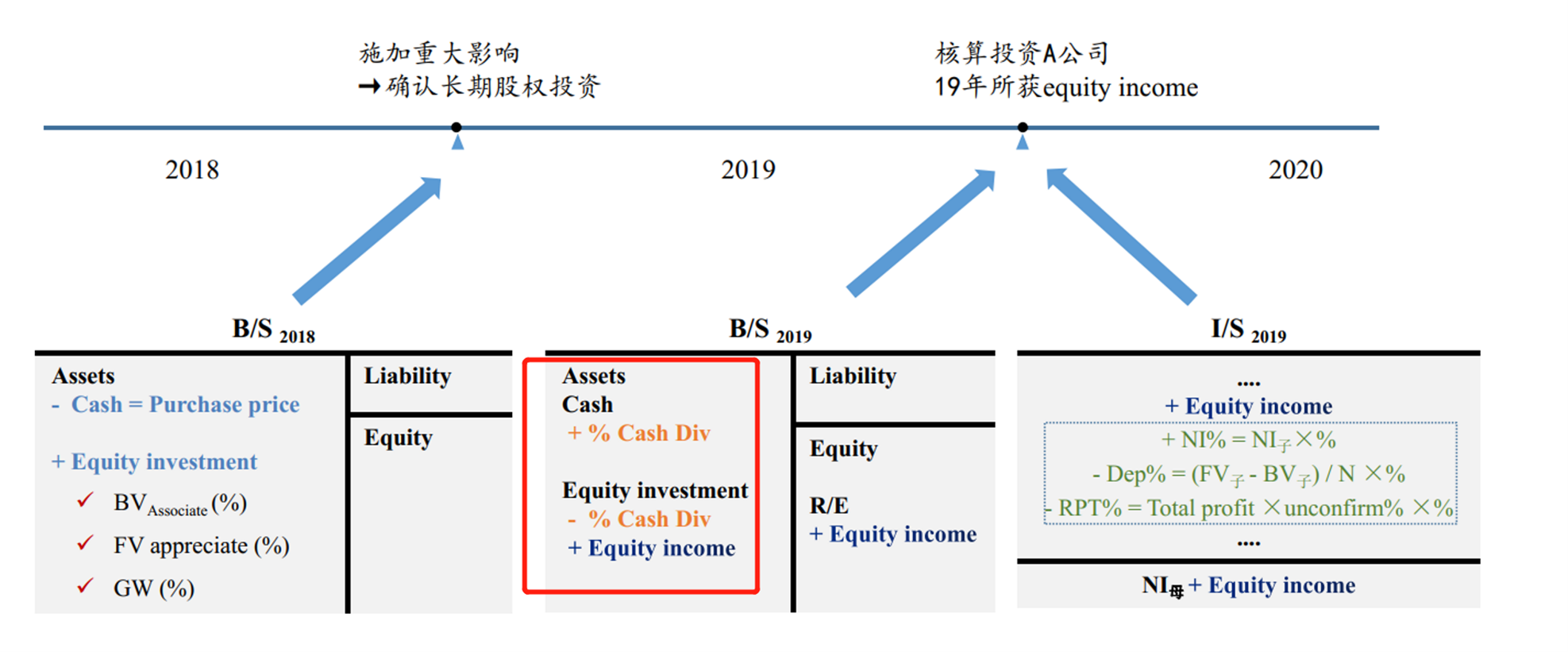 当子公司一旦发放股利,子公司的equity就会变少,从而母公司的equity investment也会减少,但是母公司的cash会因着收到的股利上升;