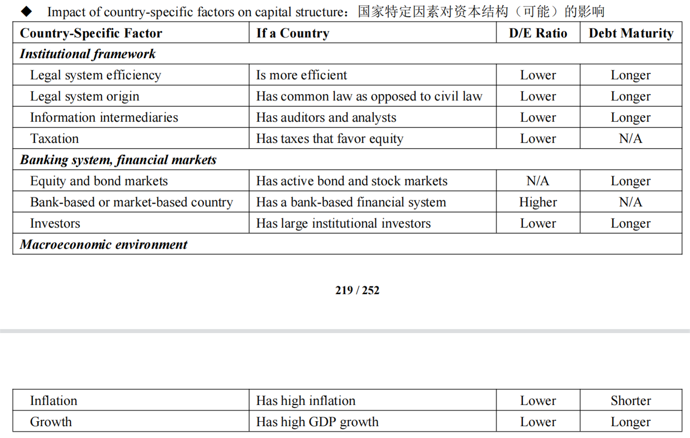 同学您好,这个PPT写的并不是很严谨,意思就是institutional investor presence就是指的一个国家的股市很发达,如果故事发达,那么公司就喜欢用股票融资,而不喜欢用债务融资,所以Lower debt to equity ratio;
