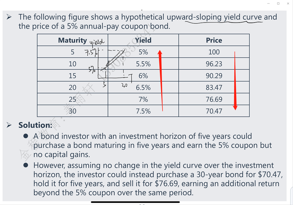 当收益曲线向上倾斜,债券临近到期日时,收益率更低,价格更高,所以叫沿着收益率曲线向下滚动。