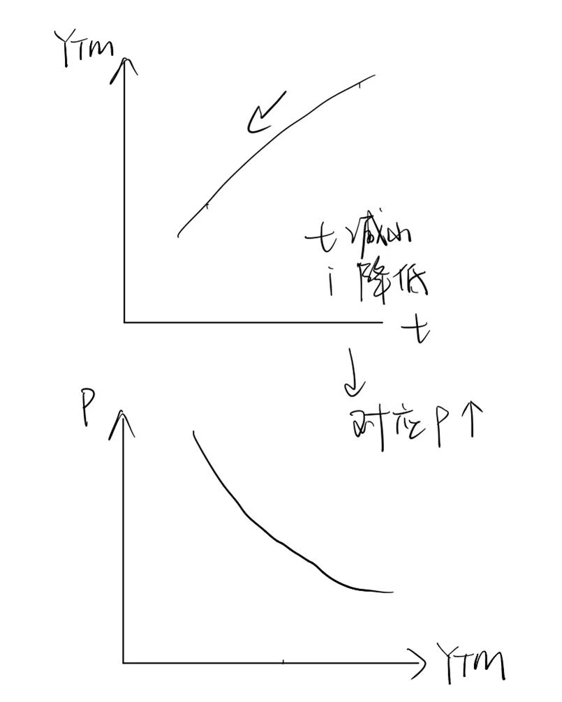 你好,对比这两张图看一下吧~第一张收益率曲线,期限越长,利率越高,第二张图更高的利率将对应更低的债券价格。