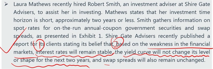 你好,注意画红线的部分,这是题目里主人公的预期,他认为未来收益率保持稳定,在未来两年,收益率曲线的水平和斜率都不会有任何变化,也就是说今天的收益率曲线是什么样的,未来2年后还是这样的,换句话说今天的s2=2.7%,两年以后再看未来两年的s2还是2.7%。本质上这里考的就是riding the yield curve策略。