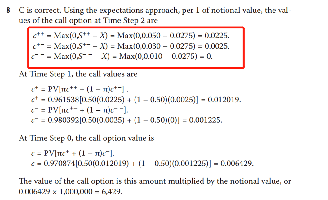 第8题,答案解析最开始算time2的时候,是不是少了一次折现。比如c++情况,是在time2时点有权力借入2.75%利率的一年债券,但是此时spot利率是5%,所以行权以2.75%借入、5%借出因此有利差收益。但这个收益是一年后兑付本息才能实现,所以time2时点的收益应该以5%对利差进行折现啊,但答案没有。