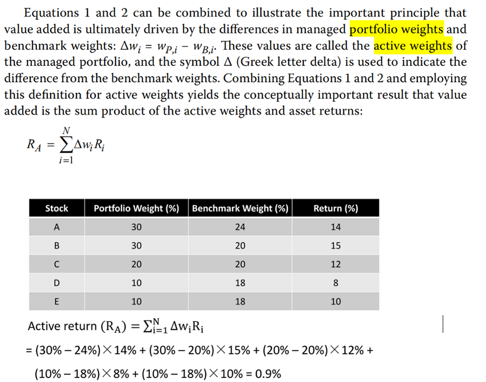 【active return的业绩归因有两个因素:一个是factor tilt,一个是个股的选择,这里面的active weights的计算指的就是考虑factor tilt,不考虑个股选择】