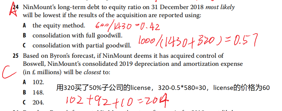 您好。关于这道题我有三个疑问。第一:Equity法下,为什么分母equity仅是母公司的价值?权益法下的B/S不是应该体现长期股权的增加吗,那权益应该并进去呀?第二:consolidation法之下,由于只投了被投公司的50%,分母的LT debt不可以用600+400*50%吗?为什么是直接加400?第三:consolidation法之下,equity的合并公式都是母公司equity+子公司的MI吗?谢谢回答。