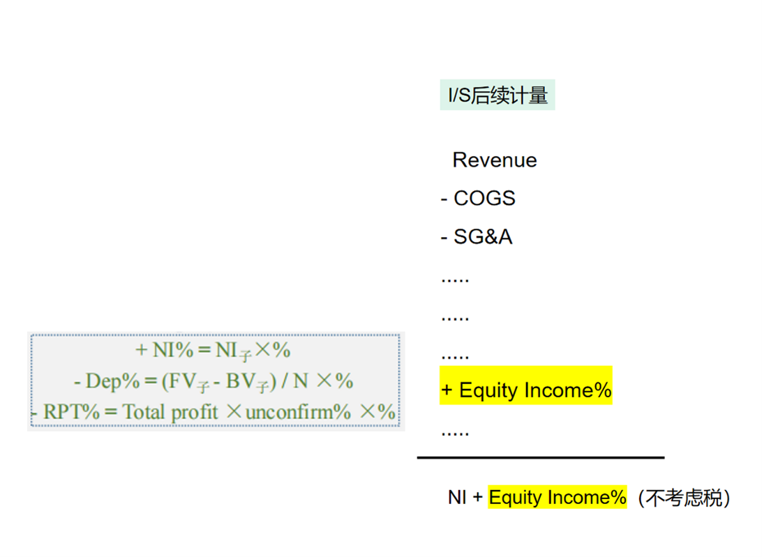 麻烦解答两问。第一个,associate investment 是指B/S中Equity的科目?第二个,图中最左边每行式子最后的%是指投资的股权比例吗?Equity income的调整应该是包含左边三项+NI-Dep-RPT? 谢谢您。