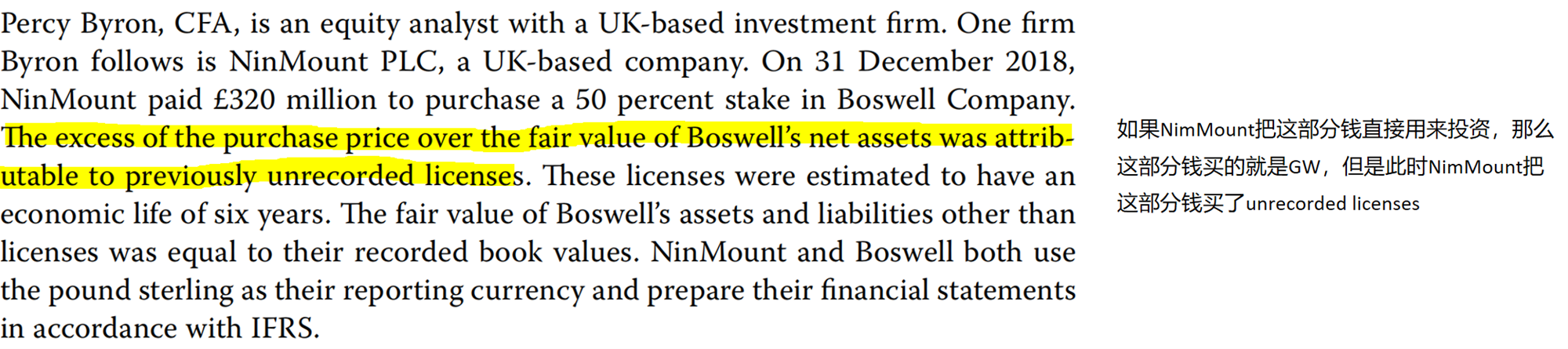 我还是无法理解为什么这里没有goodwill呢?出320购买50%,而fair value of Boswell's net assets=580,按照goodwill的公式,多出来的60不就是goodwill么?还是说,题目的意思是,60来自于这个intangible asset 的价值(license)?