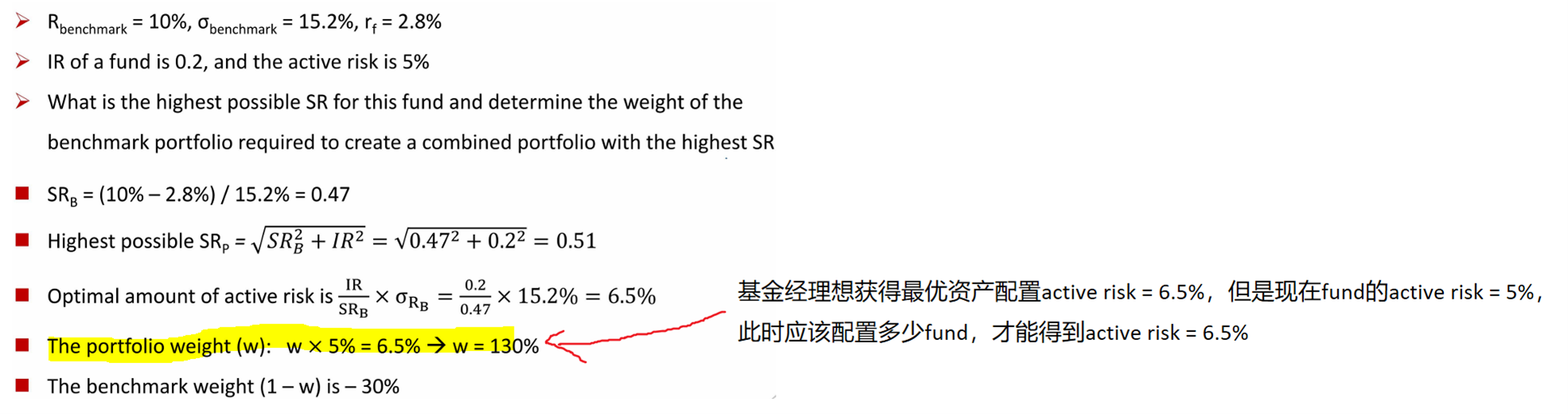 【注:配置benchmark指的被动投资,配置fund指的是主动投资。。如果你是基金经理,为了让你组合的SR最高,此时你应该拿多少钱去做主动投资,拿多少钱去做被动投资】