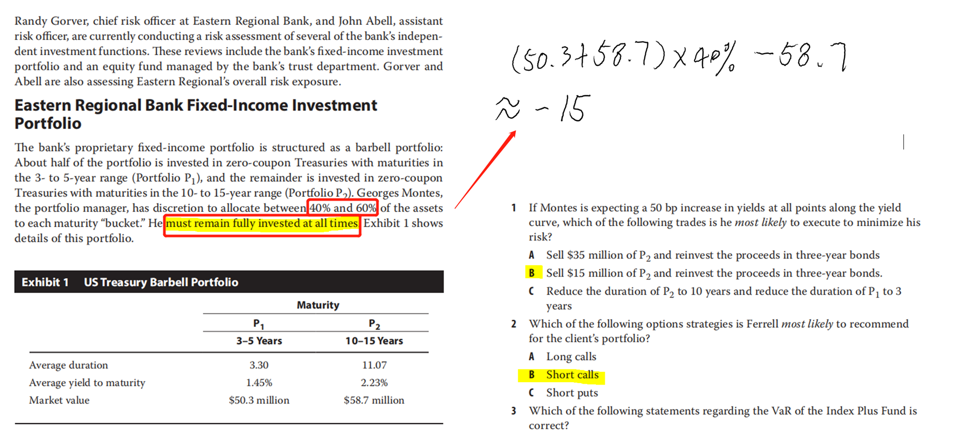 如果利率上涨,那么久期(marturity)最大的组合最容易受到影响,所以就要把P2卖出,买进P1,解题思路如图