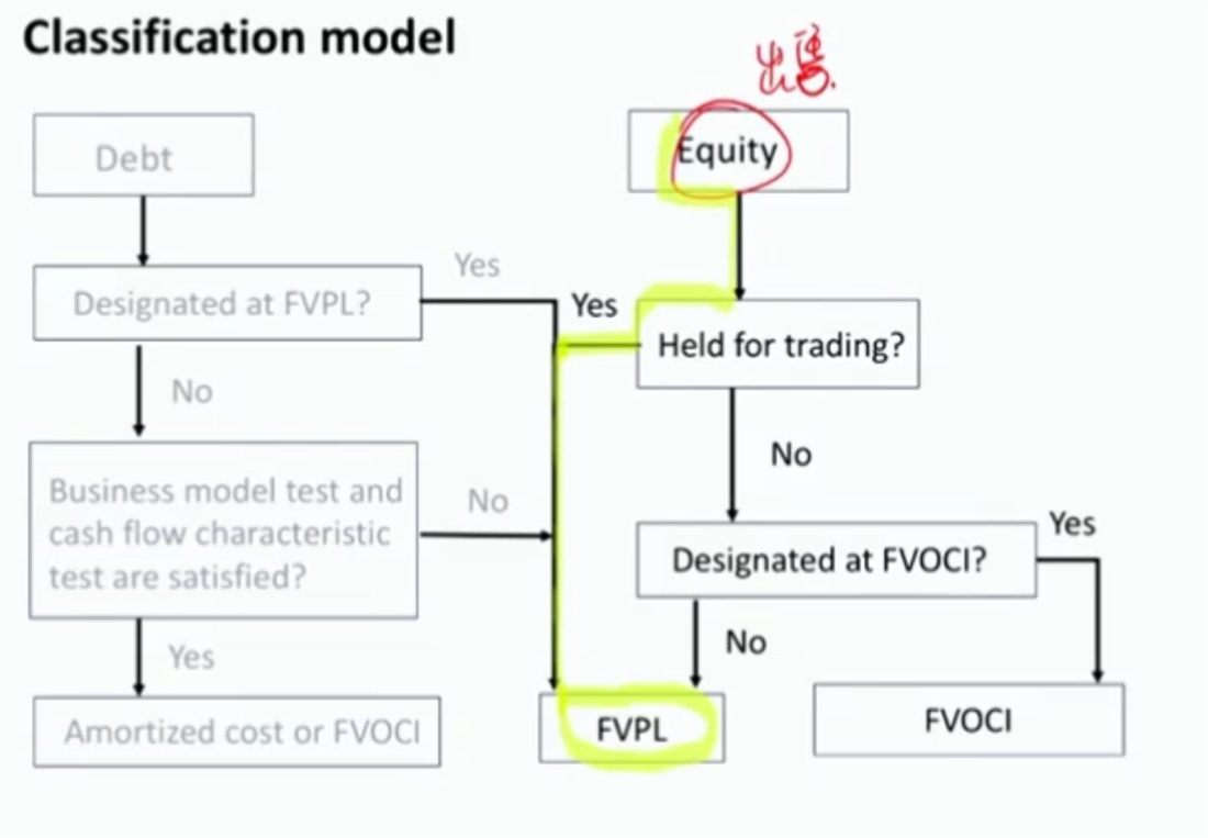 买股票的目的就是为了出售,因为股票不像债券有Maurity,所以不存在持有的目的【一般情况下持有债券到期是为了做利率的风险管理】,所以是用FVPL计量
