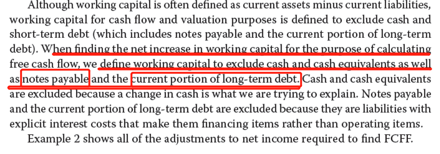 这里补充一下,比较严谨的说法,我们应该把调整过cash和debt的WC称为net WC。但权益的原版书上,在FCF这一章并没有特别去区分WC和net WC(见图),在计算FCF时默认WC就是调整过cash和debt的。我们只要知道怎么计算WCInv就行了。debt就是notes payable和current portion of long-term debt。如果题目中没有提供current liability具体的科目,那么默认没有debt部分。