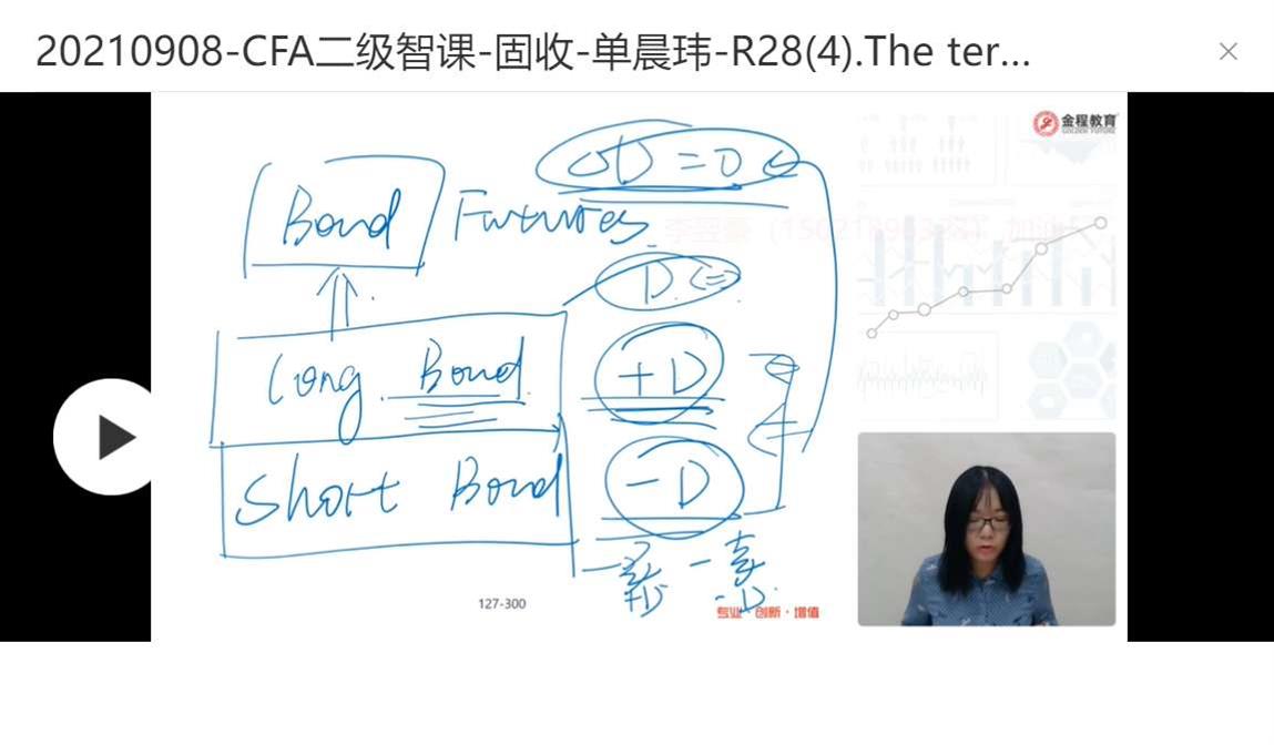 你好,请问你提问的时候有附图或者视频吗,后台看不到具体说的是哪里的问题呢。仅针对你的文字部分,duration衡量的是债券价格对利率变化的敏感性,D=0是指duration等于0。例如在一个债券组合中,有一部分的头寸是long,一部分是short,如果能将这个组合的duration调整到0,即意味着,利率的变化对债券组合的价格无影响,关于这部分的内容我们在三级才会具体学习到,现在只要了解一下就好啦。