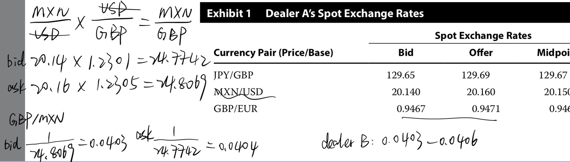 你好,根据文中dealer给的报价是GBP/MXN 0.0403/0.0406,我们可以计算一下dealer A给的价格是什么样的,然后做个比较,来看下有无套利机会。根据exhibt 1 中,我们可以发现要想得到GBP和MXN的交叉汇率,需要使用到MXN/USD和USD/GBP,计算交叉汇率得到GBP/MXN 0.0403/0.0404(步骤下图)。所以我们就得到了dealer A给出交叉汇率0.0403/0.0404,dealer B报价0.0403/0.0406。三角套汇需要存在可以买低卖高的机会,具体来说就是在一个dealer处买入的价格,需要低于能在另一个dealer那里卖出的价格,才能够套利成功。但是这里可以看到虽然在dealerA这里买MXN用到了相比dealer B更划算的价格0.0404,但是我们没法以比0.0404这个价格更高的在dealer B那里卖出,dealer B给出的bid price是小于0.0404的,也就是说没法一买一卖获得正收益,所以不存在套利机会。