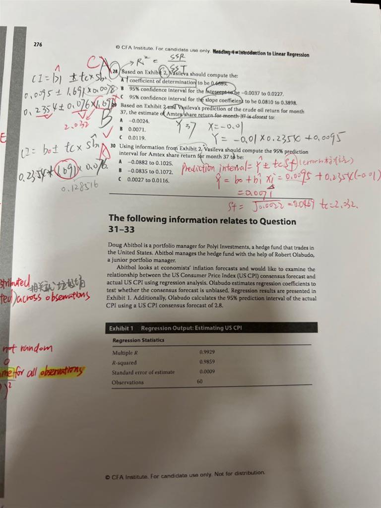 老师想问下数量课后题30,这里显然是把Month37带入算Y的估计值,但是在原CI的公式中,CI=b1+/-tc*sb1的估计值,所以b1应该是month37新公式上的斜率b37哇,为啥是整个Y在month37的估计值呢?因为是算Amtex share return(Yi)吗? 以及怎么看这题是95%的单or爽尾检验?这关系到用2.032这个tc还是题目中已提供的1.691(note处),好奇怪哦,提供的却用不到…