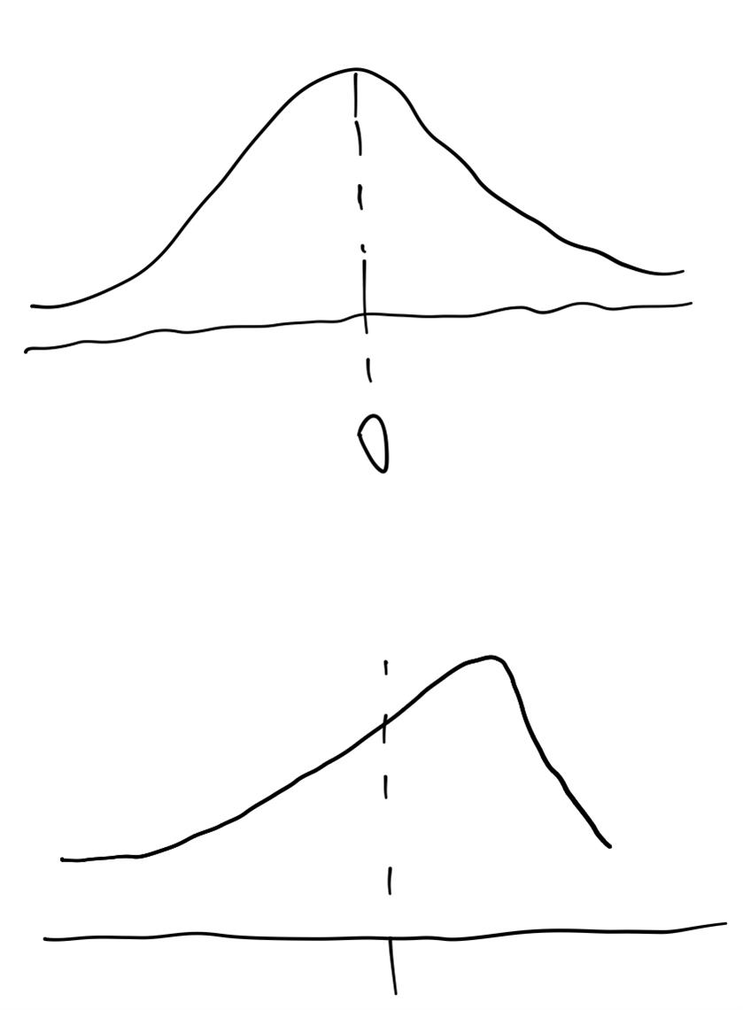 你好,尖峰肥尾左偏都是相对于正态分布来说的,这种分布的特点就是发生极端值的概率较高。上面是正态分布的图像,下面是尖峰肥尾左偏的大致图像,可以看出发生左边极大损失的概率是远高于正态分布下的概率,同时它的均值<中位数<众数,所以从期望值(均值)来看,发生损失的概率也较大。而正态分布下均值=中位数=众数,都是集中在中间。