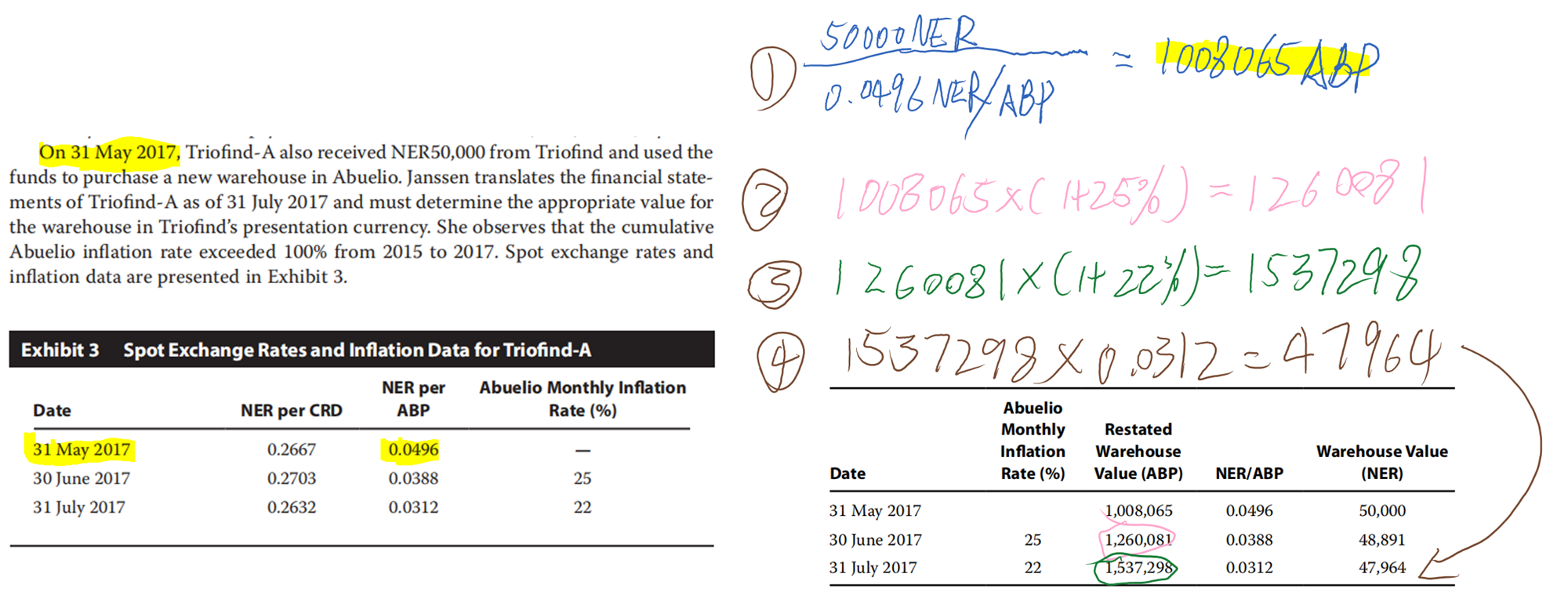 对于国际会计准则,就是先用inflation rate来restate,然后用current exchange rate来转化,计算过程如图