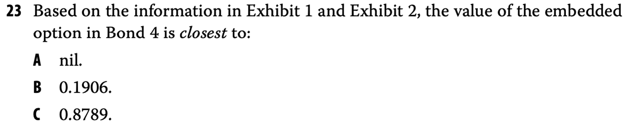 你好,以原版书的答案为主哦。原版书中答案的解释为:因为bond 4可以call at par without any protection periods,所以在这里它折现到0时刻可以和行权价格比较,所以无论何时,callable bond的价格都不能超过100。我和其他老师讨论过这个问题,其实这道题目出的有些牵强,因为如果callable bond的价格在0时刻高于100,且此时还能行权,那么没有投资者会买这样的债券了。所以对于这道题目不用过于纠结,了解其解题思路就好了。一般情况下,我们是不考虑0时刻可以行权的情况的,题目有特别说明的除外。