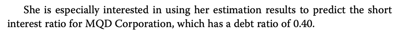 你好,Q25中问的是MQD公司对short interest ratio(因变量)的预期为多少,文章中最后一段写明了MQD预测的debt ratio是0.4,只要将这个0.4代入回归方程中,就可以得到预测的short interest ratio。加油鸭