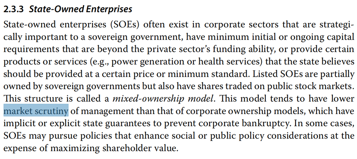 解释:market scrutiny(市场监管)这个概念是出现在state-owned corporate(国企)中,就像中国的国企,国家政府都会成为其中的股东。也就是在国企中,市场监管会少一些。。。因为一般国企不太会造假,没钱了直接有政府扶持