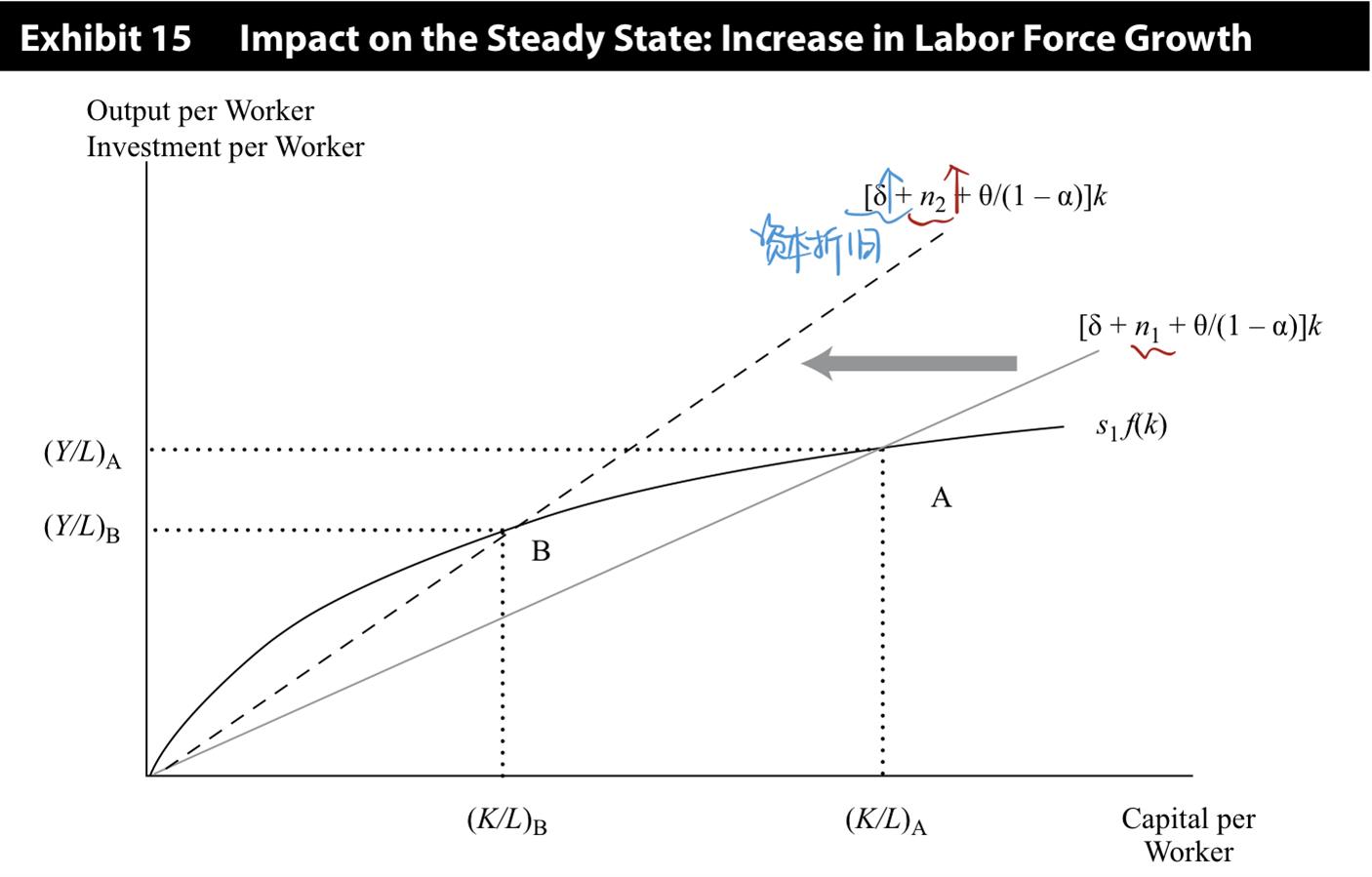 你好,这几个问题可以结合原版书P543的exhibit 15来理解(下图)。1.劳动力增长率的提高,会降低均衡状态下的资本与劳动力之比,除非相应的提高资本的稳态增长率。2.如果总储蓄率是一定的,那么资本是一定的,劳动力更多了,人均资本下降,每个工人的相对产也会减少。根据下图公式中,n增加,斜率增大,均衡点从A移动向B,所以y和k都到了一个更低的水平。3.depreciation rate是指资本的折旧率,资本折旧大了(下图蓝色标记符号),资本累积更少,人均资本就会降低,也会使直线的斜率变大,从而降低y和k。
