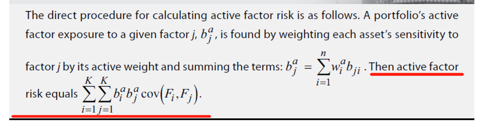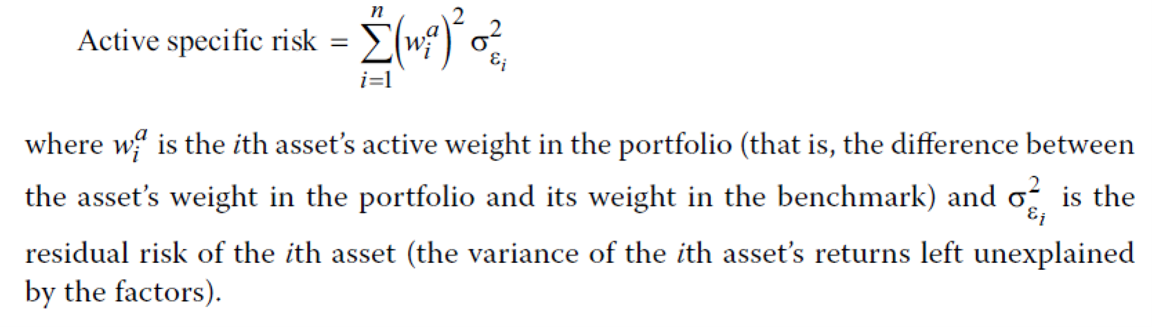 同学你好,active risk square = σ(Rp - Rb)^2。active factor risk是由于组合在因子上的主动权重贡献的方差,active specific risk是active risk square和active factor risk的差值,也就是active factor risk无法解释的那部分active risk square的部分。这两者的计算公式如下图,但不要求掌握,也不会给让你依据公式去计算。