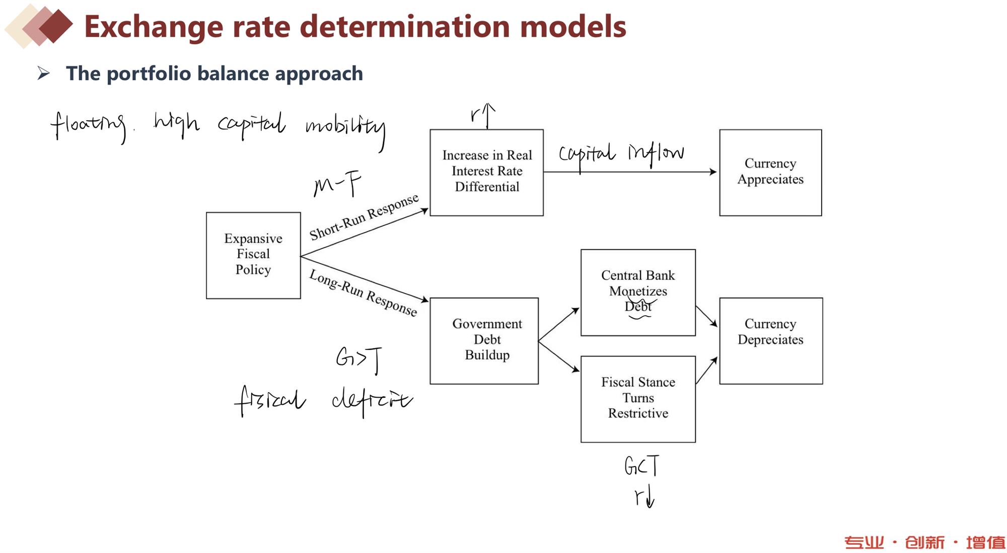你好,短期内财政政策的改变,是用蒙代尔弗莱明模型去解释的,也就是截图上老师分析的这些,同时也是下图描述的短期路径。从长期角度(下图长期路径),财政政策对汇率的影响是用portfolio balance approach去解释的。扩张的财政政策,政府支出增加,税收减少,导致财政赤字,随着政府债务负担的上升,市场参与者可能就会怀疑未来这些债务将如何兑现。如果债务量上升到被认为是不可持续的水平,那么就需要去做债务重建。投资者失去信心,会拒绝fund政府的deficit,央行最终面临将债务“货币化”的压力,也就是央行直接去印钱,然后用新印的钱购买政府的债务,那这种情况会导致短期货币最初升值的部分迅速逆转,最终本币贬值。但如果央行不是去印钱解决问题,而是收紧了财政政策,那么G<T,相当于还钱,市场上钱就多了,因此利率下降,本币贬值。所以长期角度来看,扩张的财政政策会导致本币贬值。