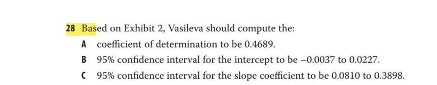 谢谢老师,比方说28题,答案C is correct. The confidence interval for the slope coefficient is calculated as:
