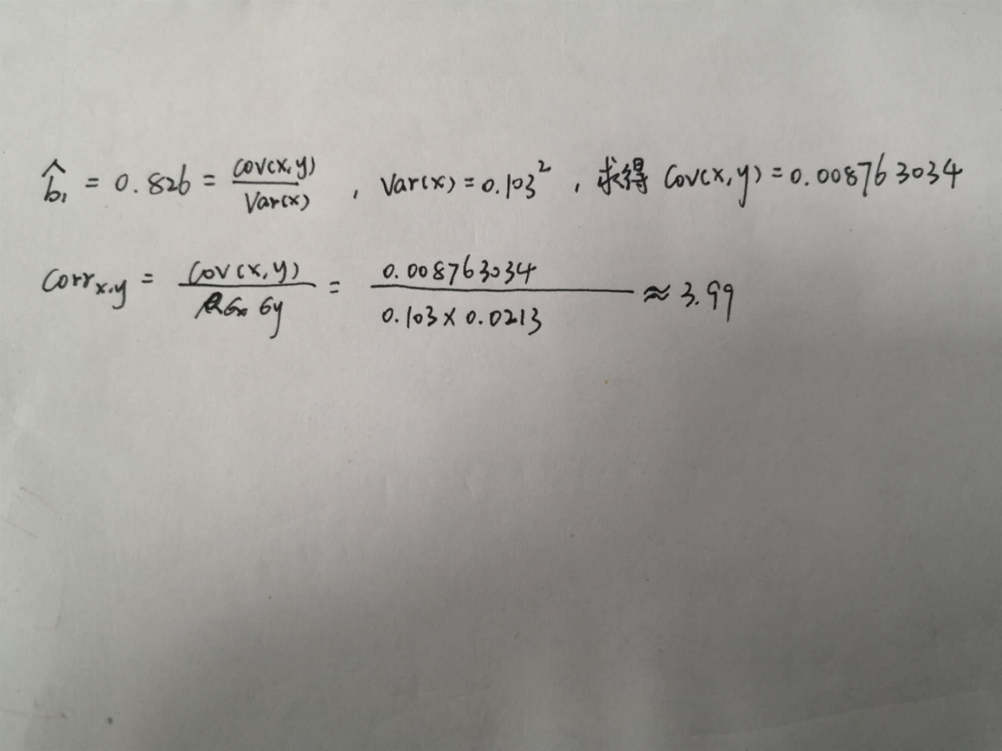 想问一下第二题中,能否通过b1估计量=COV(X,Y)/VAR(X)的公式得到COV(X,Y),再通过corr(x,y)=cov(X,Y)/sdx*sdy得到corr呢。我算了一下结果和R2开根号的结果不一致。想请教一下老师哪里出了问题。