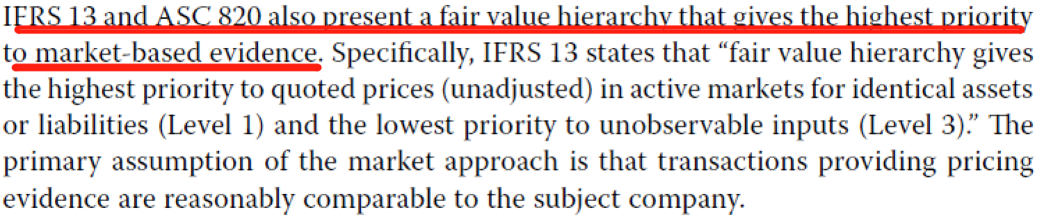 下面一句说SFAS这个财报会计标准的第157条给了公允价值方法设定了等级,并且给了market based这个方法最高的优先级。现在这个SFAS目前的原版书已经不提了,因为它在2009年之后就被另外一个标准ASC(Accounting Standards Codification)取代了。现在原版书的表述见图,但条款的内容没变。所以依然支持使用GTM这种估值方法。