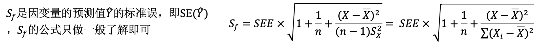 3.sf是预测值y的标准误,它没有出现在这个表格中。我们计算sf是通过下面这个公式,但是这个公式在考纲中并没有要求背诵,所以考sf的概率极低,考试中一般是作为题目条件给出的,但是它的性质需要掌握。standard error of regression是整个回归的标准误,衡量回归模型可以解释的所有样本内数据的标准差。