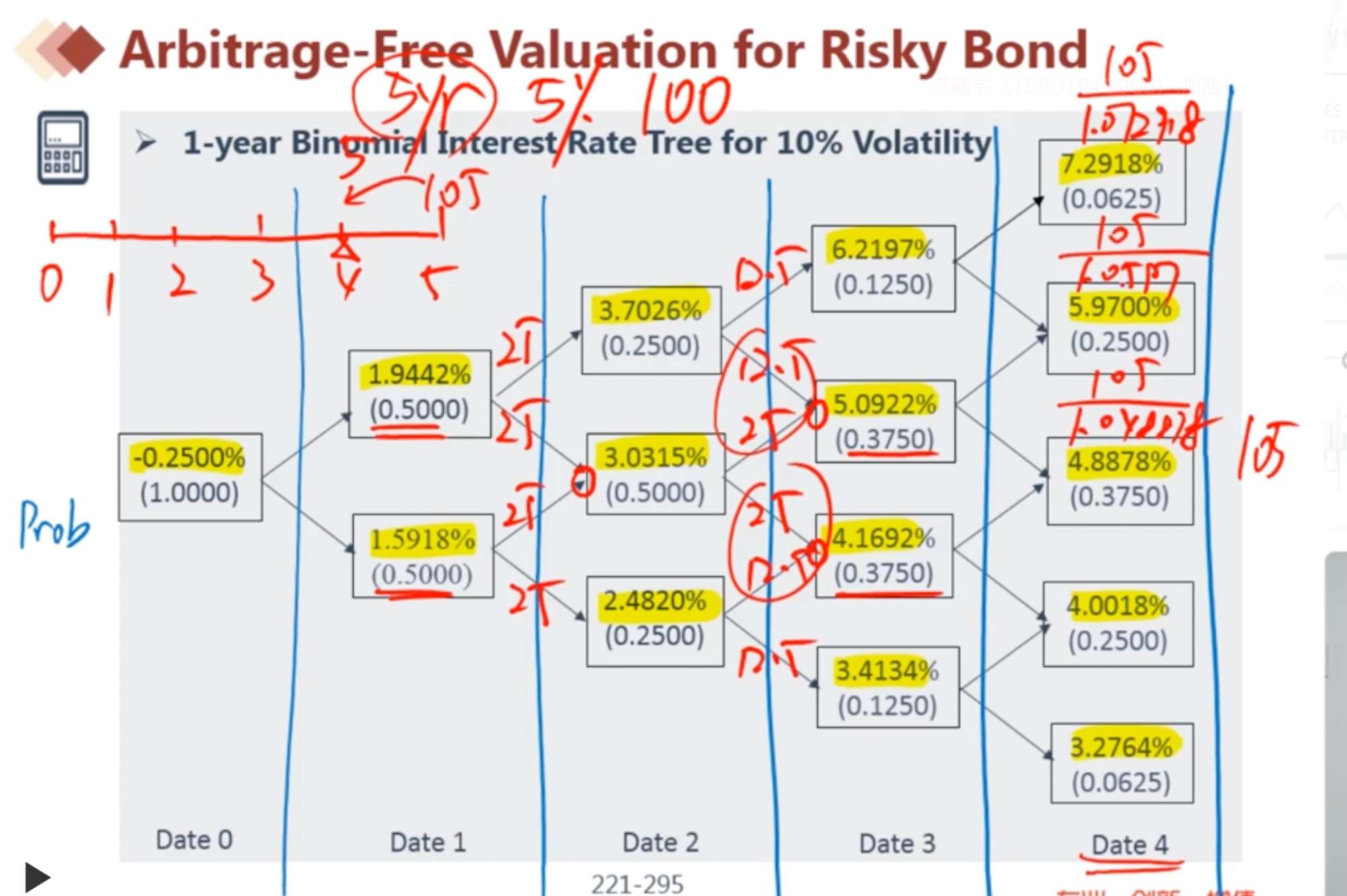 图上标的同一年份下,不同的概率是针对预期敞口的。以date 3 为例,如果要计算这一时刻的expected exposure,那么是将债券在这四个节点的价值乘以对应的概率,计算求得的。