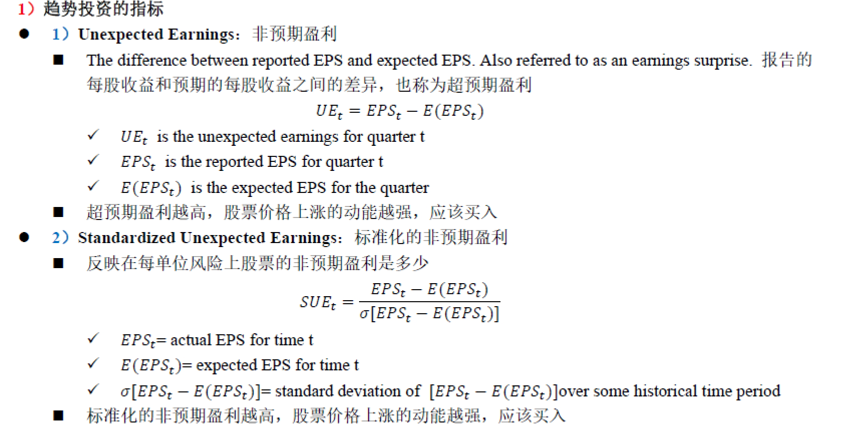 根据SUE的计算公式(见图),SUE是过去的Unexpected earnings除以Unexpected earnings的标准差,不是expected earings的标准差,因此statement 6不对。